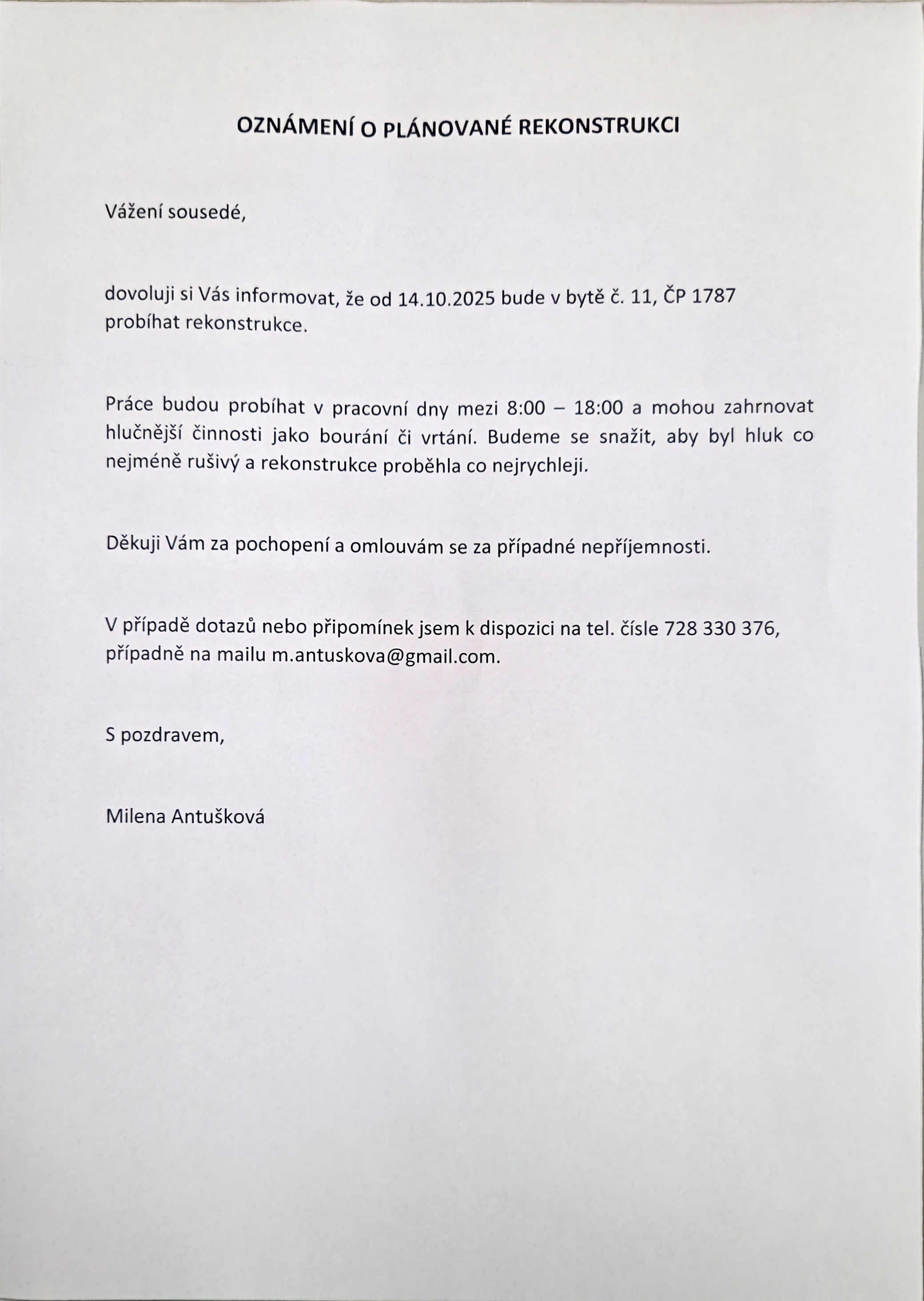 Vážení členové družstva, dovolujeme si Vás informovat, že od 14. 10. 2025 budou v pracovní dny mezi 8:00 - 18:00 probíhat stavební práce .